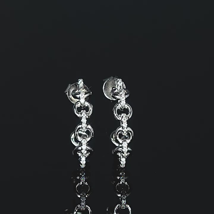 全長2.5インチ、チェーンドロップ2インチのモアッサナイトチェーンイヤリングです。縦長のデザインは丸顔に美しく映え、縦のラインを描きます。繊細なプロポーションはどんな顔の形にも似合い、エレガントで魅力的な装いを演出します。